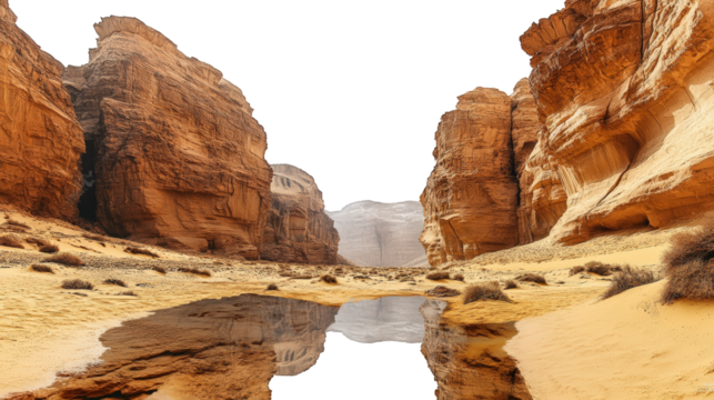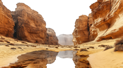 a stunning desert landscape characterized by towering rock formations and a serene water reflection the warm tones of the rocks contrast with the calm water. creating a tranquil atmosphere that highli