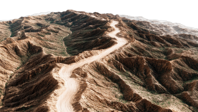 A winding dirt road ascends a rugged, arid mountain landscape