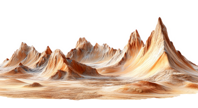 Desert landscape with rugged mountains and rolling sand dunes cut out on transparent background