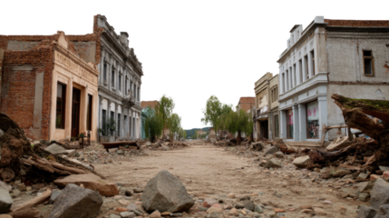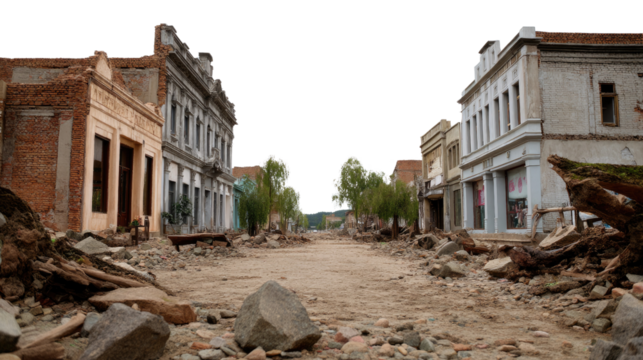 Abandoned Street: A deserted street lined with aged buildings, hinting at a forgotten past, the remnants of a forgotten event scattered across the road.