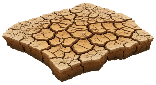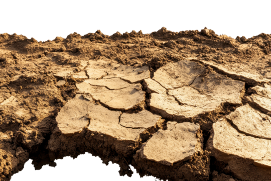 Cracked earth texture showing drought impact, dry soil with fractures, desertification concept, transparent background