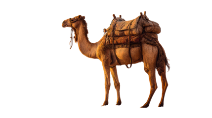 Camel laden with cargo traverses desert sands at sunrise, symbolizing travel, adventure, and historical trade routes in arid landscapes.