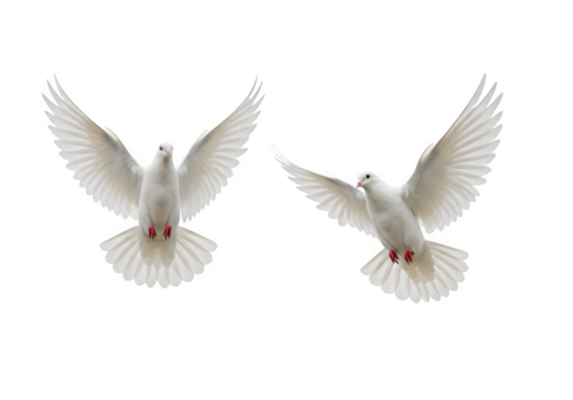 Two white doves are in flight, symbolizing peace and freedom. Great for logos, backgrounds, or designs promoting peace and unity isolated on white or transparent background. PNG