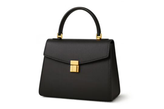 Elegant black leather handbag with gold hardware, isolated on transparent background