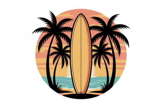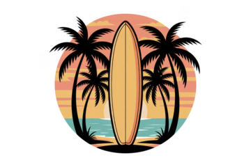 Retro sunset graphic featuring a surfboard standing upright between two pairs of silhouetted palm trees on a beach isolated on transparent background