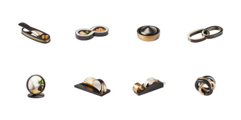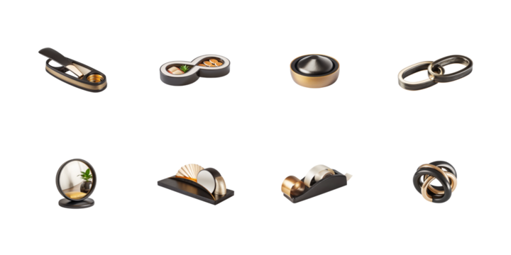 Collection of modern luxury desk accessories featuring black and gold accents displayed against a black background on transparent background