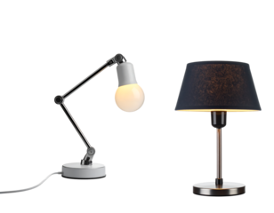 Two different desk lamps one modern adjustable and one classic with a dark shade isolated on transparent background