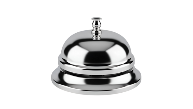 Close up of a classic highly polished chrome service bell with a distinct round base and plunger top isolated on transparent background