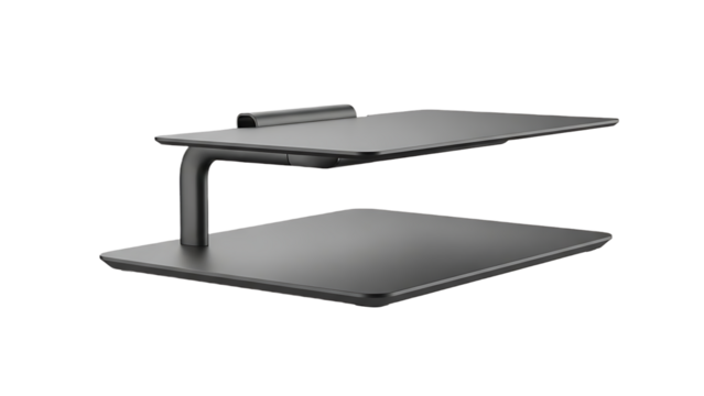 Modern black monitor stand with two shelves ergonomic desk riser for computer screen and laptop isolated on white background