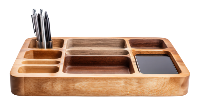 Wooden desk organizer with compartments background isolated on a Transparent background, PNG file.