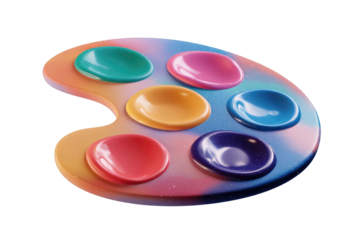 A colorful, rainbow-splattered paint palette with six recessed wells for paint. background removed