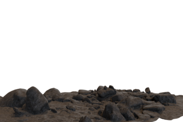 A desolate, rocky ground surface with various sizes of grey and brown stones and coarse dirt. The uneven terrain is set against a stark, empty background