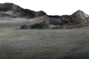 Rugged barren mountain landscape, jagged rock formations, dry textured earth with sparse desert vegetation against a transparent isolated background, low angle view, bright diffused lighting,
