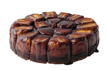Minimal dessert presentation of caramel cheesecake on bright white surface isolated on transparent background