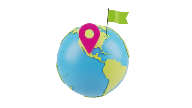 Isolated World globe with location pointer and flag marker denoting a travel destination