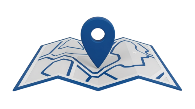 A blue location pin on a folded map, symbolizing navigation and destination.