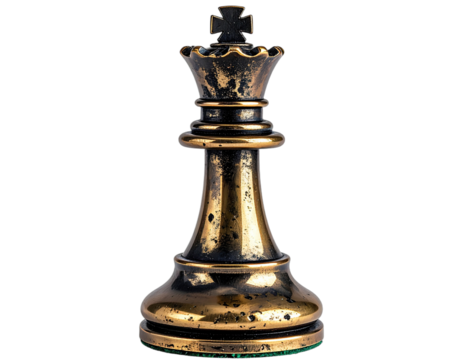 Bronze chess queen piece standing alone on a white background with detailed craftsmanship and elegant design