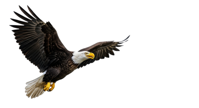 Majestic bald eagle soaring dynamically, powerful dark brown wings, white head/tail, yellow beak/talons, gaze right creating copy space, on transparent background. Concept of leadership and