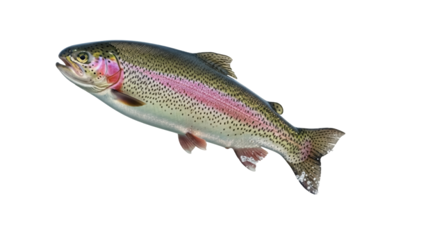 Isolated rainbow trout with speckled body, an adult fish with a broad pink stripe