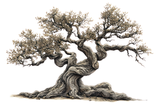 An artistic drawing of a tree with twisted branches and detailed bark texture, depicting each leaf individually in a sketch style.