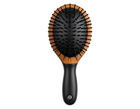 Black oval paddle hair brush with detangling bristles isolated on transparent background