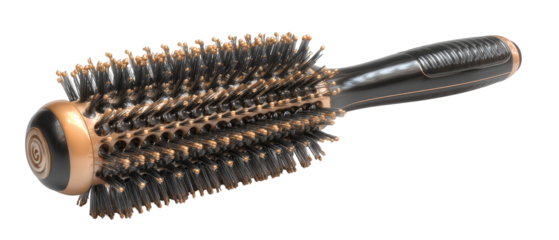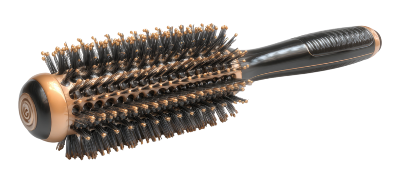 Black paddle hair brush with rounded bristles on a dark background isolated on a transparent background
