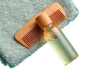 Light-green towel draped over, with wooden comb and small amber bottle of hair oil