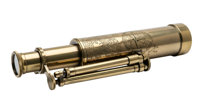 Brass telescope with etched world map detail and tripod stand