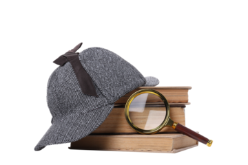 PNG,Magnifying glass with fingerprints, books and hat, isolated on white background