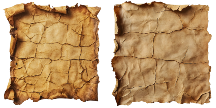 Aged parchment paper with rough, torn edges, showcasing a vintage and worn appearance. isolated on a transparent background