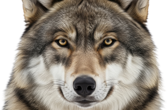 Full face gray wolf portrait looking directly forward on a transparent background PNG image