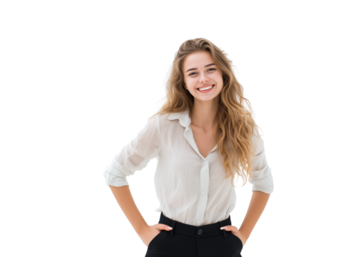 Portrait of a cheerful young businesswoman with a radiant smile and long wavy hair, posing confidently with hands in pockets, isolated on a white background.