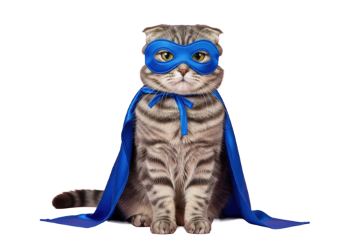 Fluffy grey tabby Scottish Fold cat with blue superhero mask and cape, sitting poised on light pink studio background, serious determined expression, humorous pet costume concept