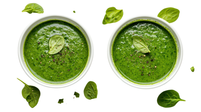 Spinach soup and green detox soup two bowls side by side healthy on transparent background