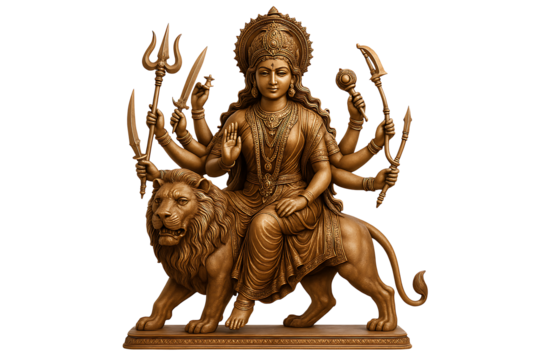Golden statue of goddess durga seated on lion with multiple arms holding trident axe conch lotus and weapons symbolizing hindu spirituality devotion power victory and blessings