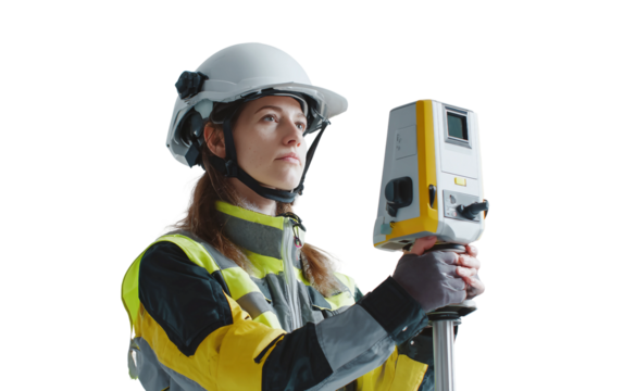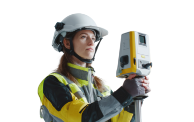Female engineer checking laser measuring device on site demonstrating precision and professional expertise isolated on transparent background PNG