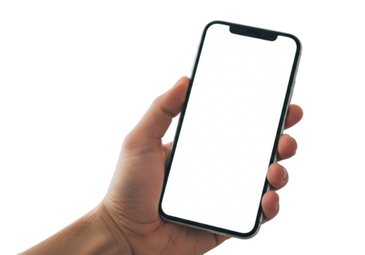 Hand holding a modern smartphone with a blank white screen, showcasing app design, isolated on transparent background perfect for mobile technology mockups