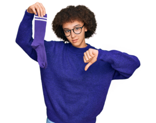 Young hispanic girl holding sporty sock with angry face, negative sign showing dislike with thumbs down, rejection concept