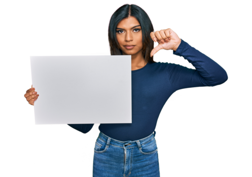 Beautiful hispanic woman holding blank empty banner with angry face, negative sign showing dislike with thumbs down, rejection concept