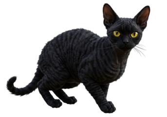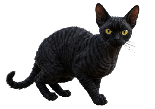Isolated Striking Black Devon Rex Cat with Yellow Eyes Posing