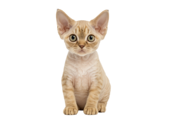 Adorable Devon Rex Cat Sitting Elegantly Against a White Background with Cute Features and Expressive Eyes