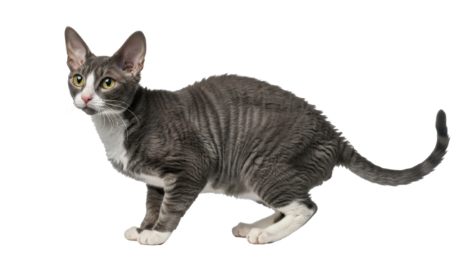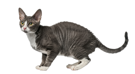 A beautiful Devon Rex cat showing off its unique curly fur in a graceful pose.