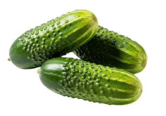Three vibrant green cucumbers with bumpy texture and dew drops, arranged against a transparent background with copy space, concept of healthy eating and natural freshness.
