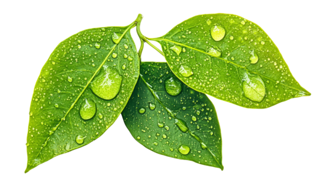Beautiful natural dew drops or rain on fresh  leaves isolated on transparent background. Close-up macro detail.