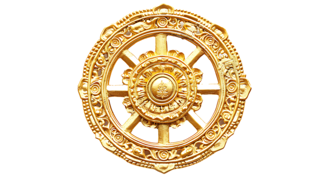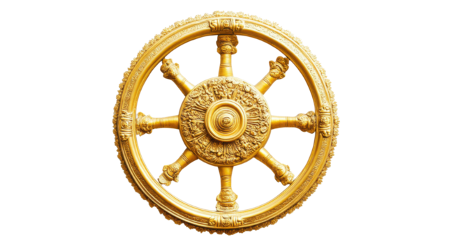 A depiction of the Wheel of Dharma with eight golden spokes, isolated on white, cut out