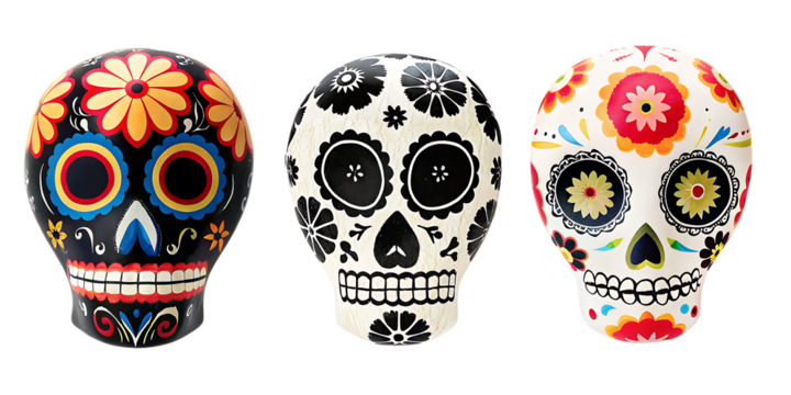 Three Sugar Skulls from dia de muertos Different Sizes Front Row Transparent Background