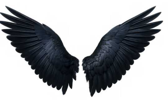 Black feathered demonic wings spread wide, realistic dark angel or raven bird wings, transparent background
