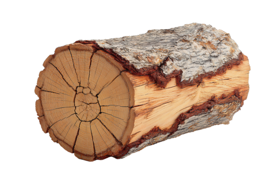 Small ornamental log with visible growth rings, bark partly stripped and fine end-grain cracks detailed, diagonal placement, transparent background.
