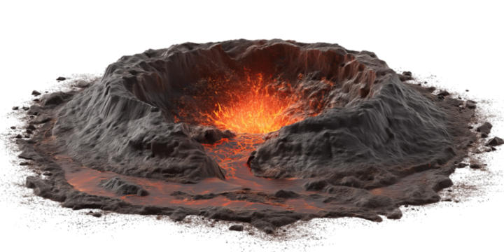 An active volcano erupts with a vivid display of fiery lava flowing down its dark, textured slopes, depicted on a transparent background.