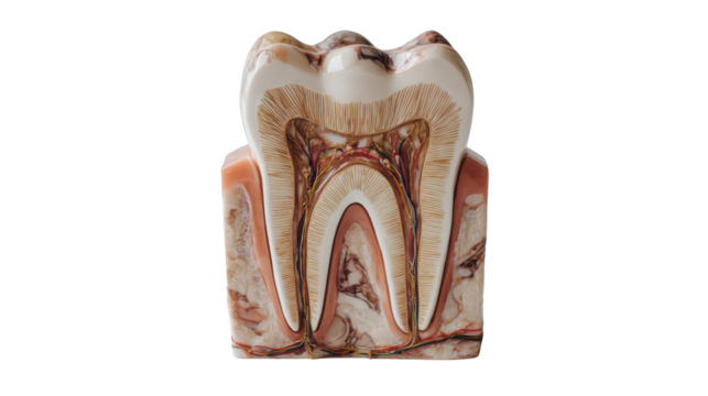 Human molar tooth anatomy model showing cross section, detailing pulp, dentin, enamel structure, and root canal system